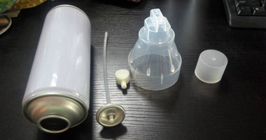 組成部件:保護罩、面罩、按鈕噴頭、閥門、墊圈(橡膠)、瓶體(馬口鐵)。
