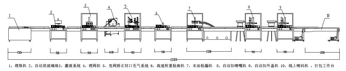 由理瓶工作臺(tái)、全自動(dòng)灌料機(jī)、自動(dòng)上閥門(mén)機(jī)、自動(dòng)封口充氣機(jī)、自動(dòng)稱(chēng)重、自動(dòng)水檢,自動(dòng)上噴嘴機(jī)、自動(dòng)上大蓋機(jī)、線(xiàn)上噴碼機(jī)、封箱打包組成??杉优渥詣?dòng)放玻璃珠機(jī),貼標(biāo)機(jī),貼管機(jī)。輸送系統(tǒng)可按U型回轉(zhuǎn)式結(jié)構(gòu)設(shè)計(jì),節(jié)省場(chǎng)地。該機(jī)具有生產(chǎn)效率高、安全可靠、操作簡(jiǎn)單、維修方便,主要技術(shù)指標(biāo)完全達(dá)到國(guó)外同類(lèi)產(chǎn)品水平。
